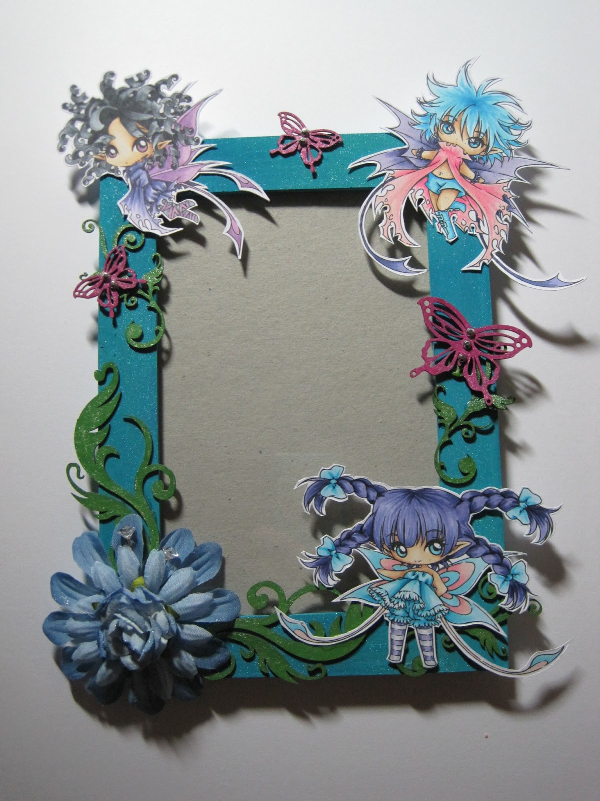 The frame has been painted in a turquoise acrylic paint and then spritzed with a combination of Dylusions and Glimmer mist to make it sparkle.